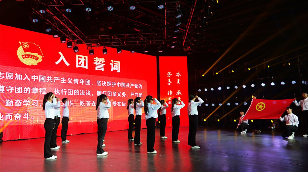 新團員入團儀式上,法學院白宇春同學帶領團員們在團旗下莊嚴宣誓,嘹亮的聲音在演播廳回蕩,莊嚴的誓詞寄托堅定的理想。團員青年們目光堅定,斗志昂揚,立志以青春敬年華,以青春獻人民,賡續奮斗精神,厚植青年擔當,展現青春風采。