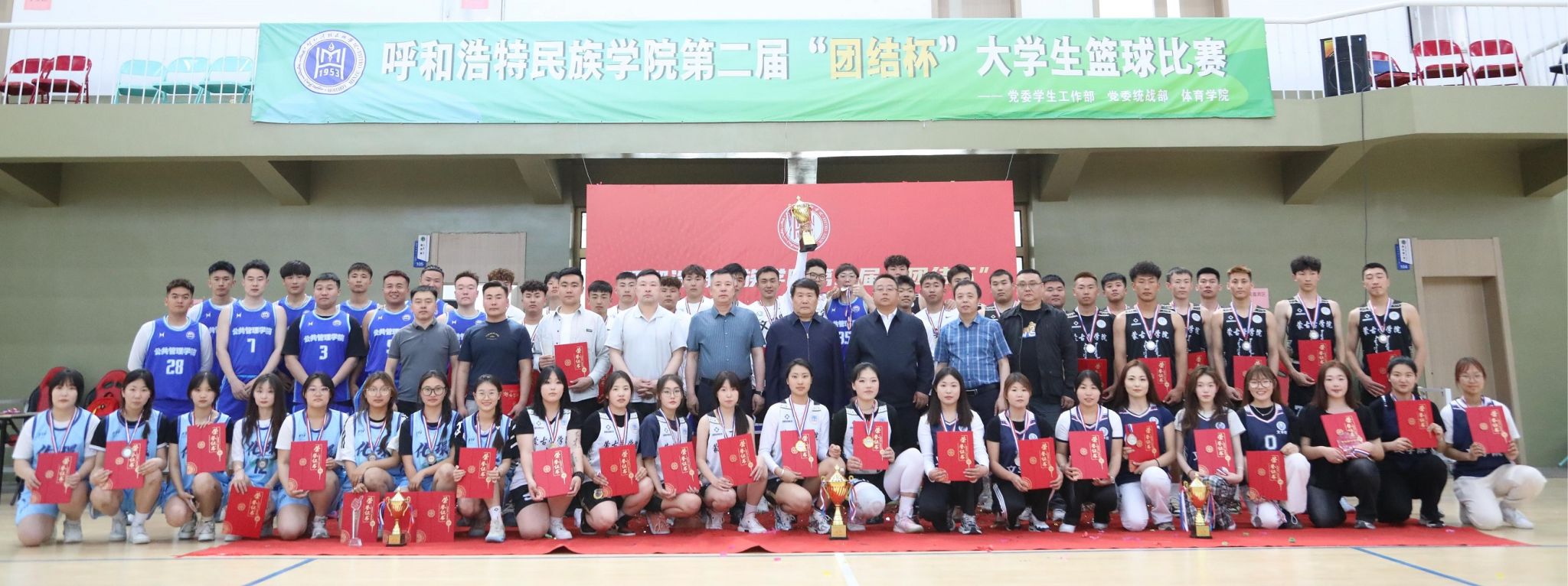 為持續深化鑄牢中華民族共同體意識,推進學校“23456”民族團結進步創建工程,促進各民族大學生交往交流交融,豐富校園文化活動,有效提高大學生身體素質水平,黨委統戰部、學生工作部、體育學院于5月6日至5月13日聯合舉辦了“籃壇爭雄強體魄,傾心逐夢展風采”主題第二屆“團結杯”大學生籃球比賽。來自各學院的16支男子隊伍和8支女子隊伍報名參賽,整體賽事總共進行了48場比賽。校黨委委員、統戰部部長包君,學生工作部部長常喜,體育學院院長烏日根牧仁出席頒獎儀式并現場觀看決賽。
