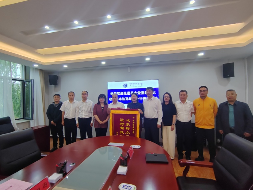 座談會上,格根哈斯向孫瑞冰一行介紹了學校基本情況。孫瑞冰介紹了奈林稿村接受我校包聯幫扶以來開展的工作情況及取得的積極成效,充分肯定了我校派出駐村干部、奈林稿村第一書記胡寶泉同志的工作。希望我校在助力奈林稿村鄉村振興工作方面開創新局面,同時向學校贈送了錦旗。與會人員就如何更好推進校地合作、落實幫扶工作方面進行了交流發言。