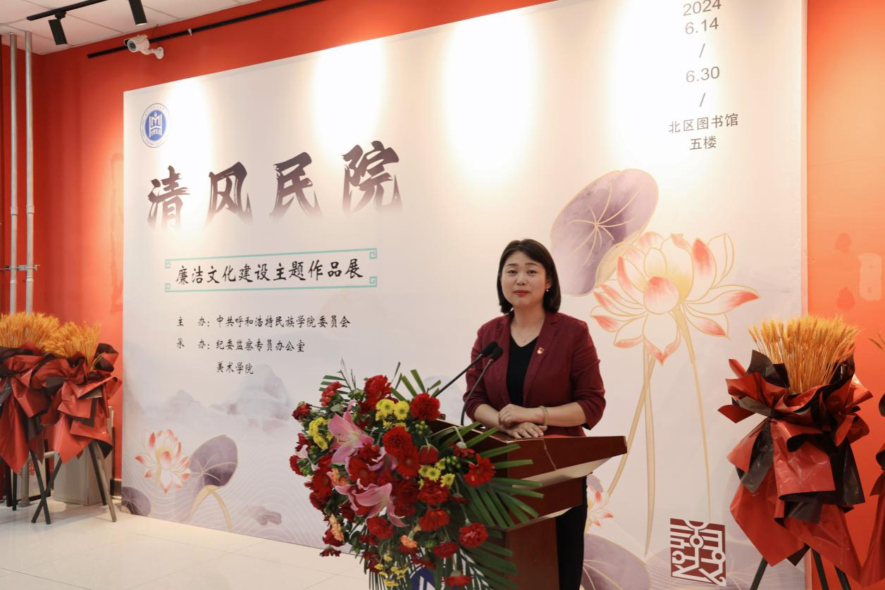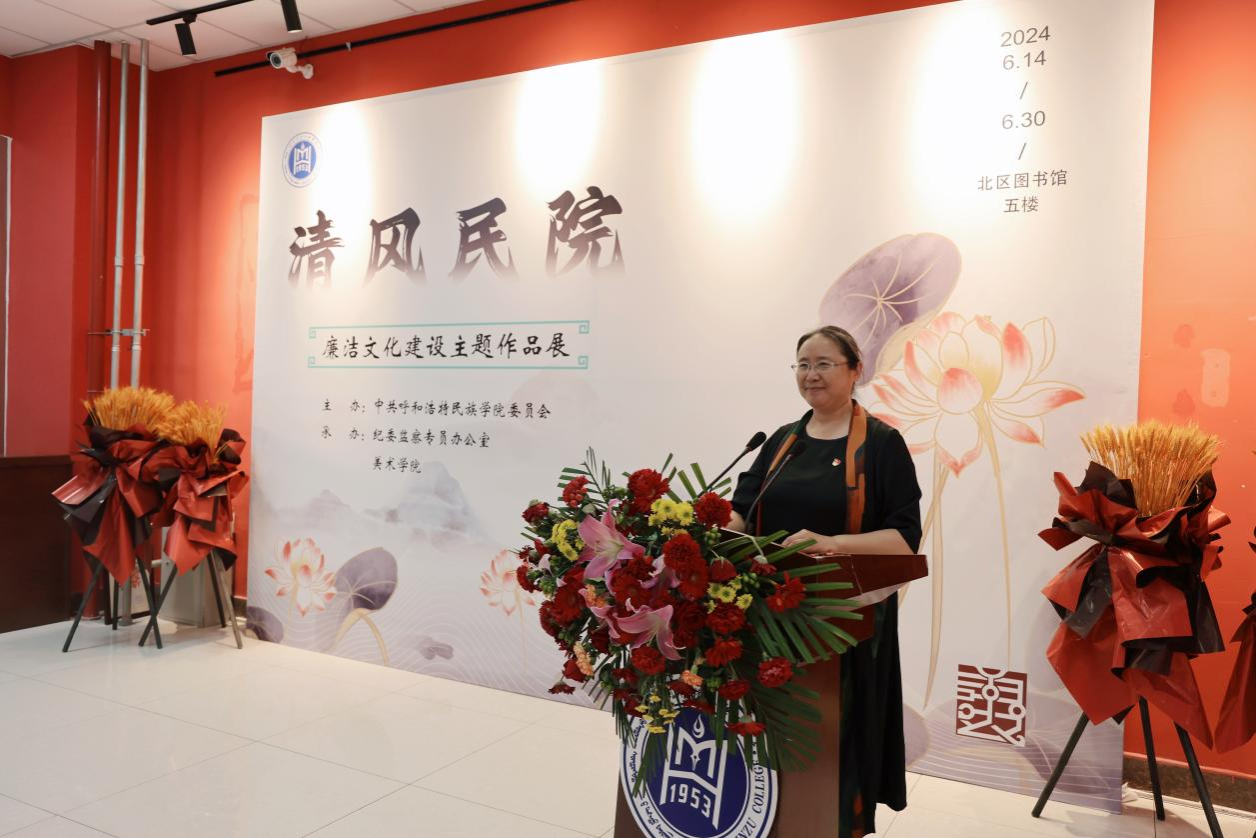 按照學校黨委黨紀學習教育工作部署,6月19日,我校“清風民院”廉潔文化建設主題作品展在北圖書館開幕。校黨委書記劉九萬,黨委副書記格根哈斯,黨委委員、紀委書記、監察專員王冬梅,黨委委員、副校長高喜天出席開幕式。格根哈斯致開幕辭,王冬梅主持。