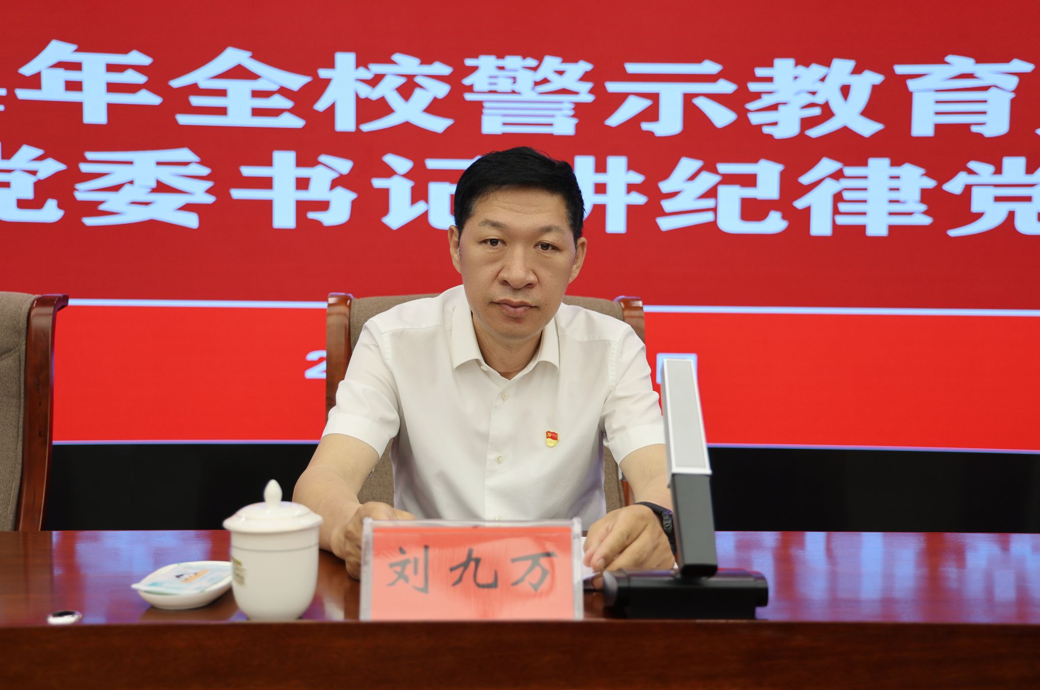 會上,劉九萬以《全面加強黨的紀律建設 進一步推動學校事業高質量發展》為題講授了紀律黨課。他指出,黨紀學習教育已經進入中期階段,各項工作有序開展,取得了階段性成效。當前,要更加務實地抓好下一階段各項工作,努力把黨紀學習教育成效轉化為推動學校各項事業高質量發展的強大動力。一是要做到學習不停步,在學思踐悟中牢記初心使命,進一步強化政治意識。要在學習黨紀黨規中提高政治站位,提升政治能力,增強斗爭精神。二是要做到提升不停步,在細照篤行中不斷修煉自我,進一步加強黨性修養。要把自己擺進去,把工作擺進去,把職責擺進去,對照“六大紀律”,檢視不足,加以改進,提升自身黨性修養,提高免疫能力,增強政治定力、紀律定力、道德定力、抵腐定力,始終做到忠誠干凈擔當。要堅持以案說德、以案說紀、以案說法、以案說責,從嚴管理干部、從緊轉變作風,讓紀律挺起來、規矩立起來、作風實起來,讓各級干部受警醒、明底線、知敬畏,努力營造風清氣正、干事創業的良好氛圍。三是要做到發展不停步,在知行合一中主動擔當作為,進一步推動學校事業高質量發展。各項工作要突出“嚴”與“實”,各級黨組織要壓實責任,各級干部要敢于擔當作為,加快推進學校內涵發展、轉型發展。