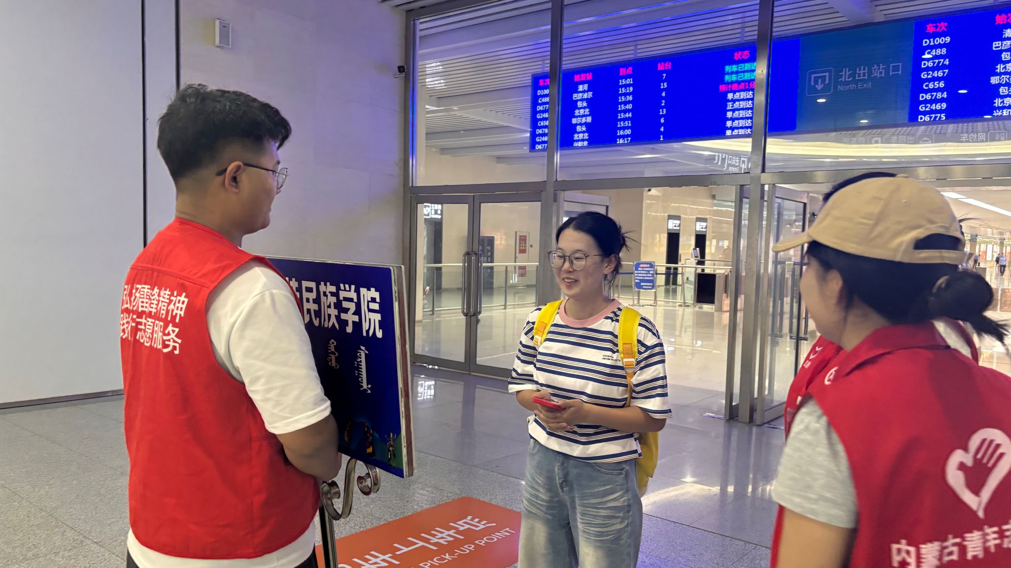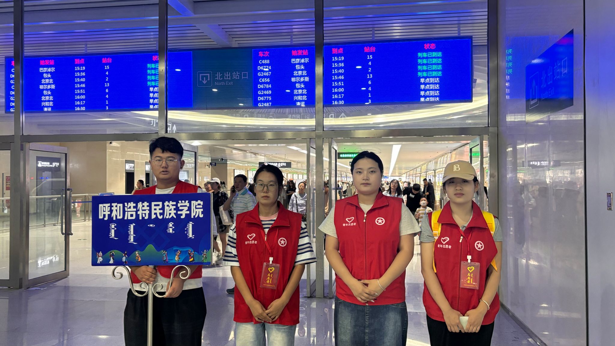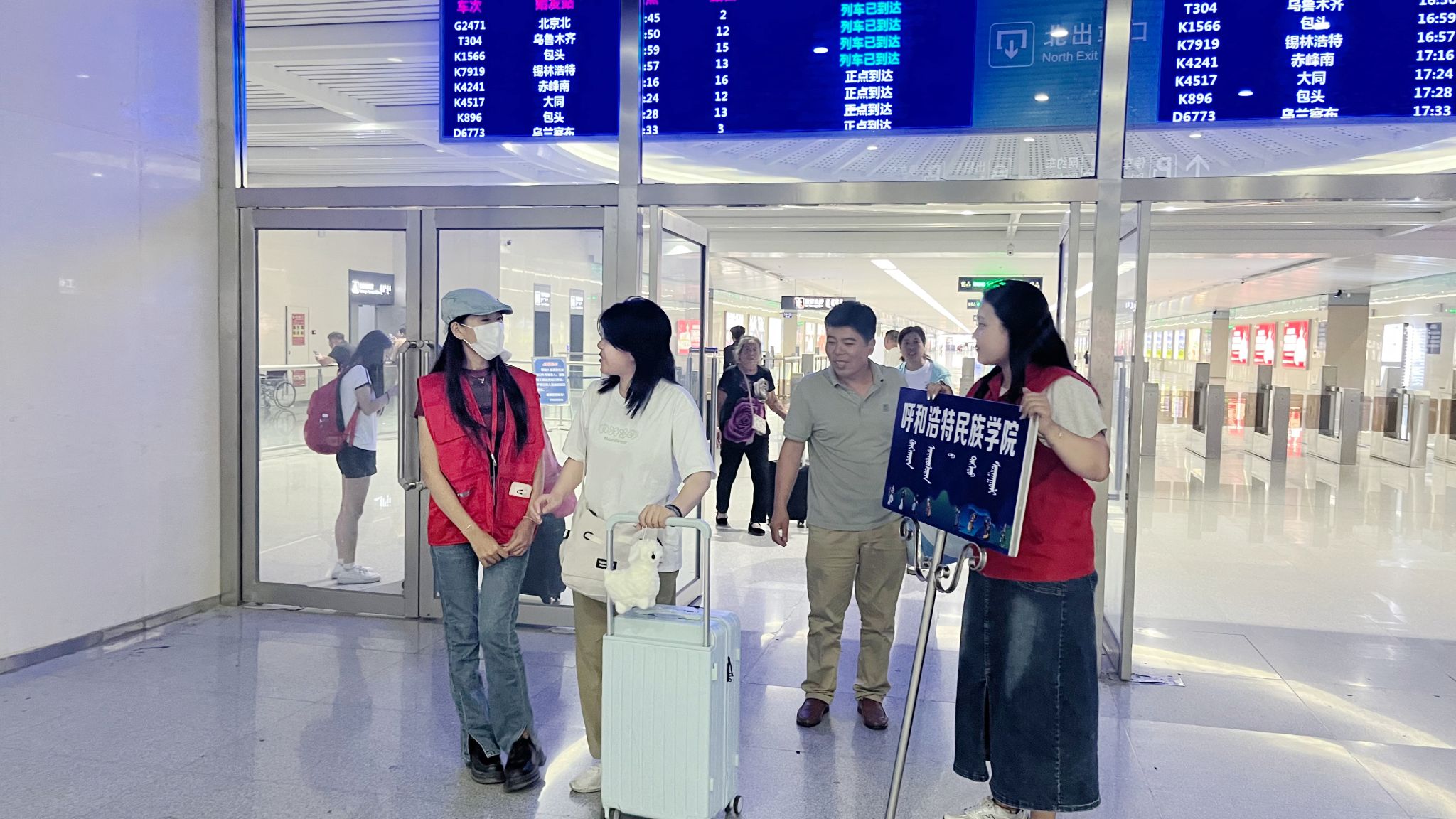 晨曦初露,青年志愿者在火車站東站迎接新同學,為新生送上了來自呼民院的第一份溫暖。