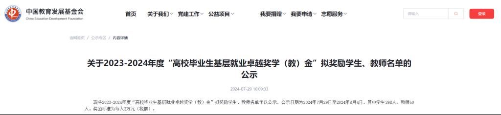 據(jù)悉,該獎(jiǎng)項(xiàng)由教育部高校學(xué)生司(高校畢業(yè)生就業(yè)服務(wù)司)和教育部學(xué)生服務(wù)與素質(zhì)發(fā)展中心共同指導(dǎo)、中國(guó)教育發(fā)展基金會(huì)設(shè)立,旨在貫徹落實(shí)黨中央、國(guó)務(wù)院關(guān)于引導(dǎo)和鼓勵(lì)高校畢業(yè)生到基層就業(yè)的決策部署,獎(jiǎng)勵(lì)赴基層就業(yè)創(chuàng)業(yè)并作出突出業(yè)績(jī)的普通高校畢業(yè)生。