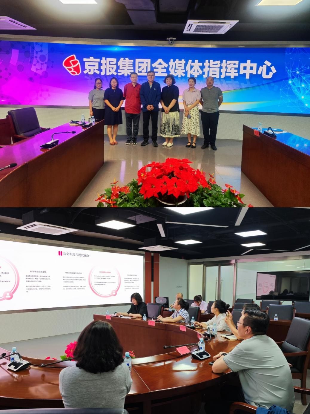 在京報集團全媒體指揮中心,調研組一行與指揮中心主任張鵬對當前新聞人才培養、教學改革和學科建設目標進行了深入探討。