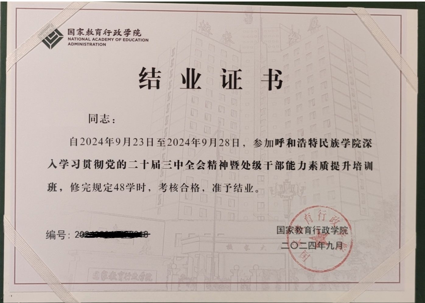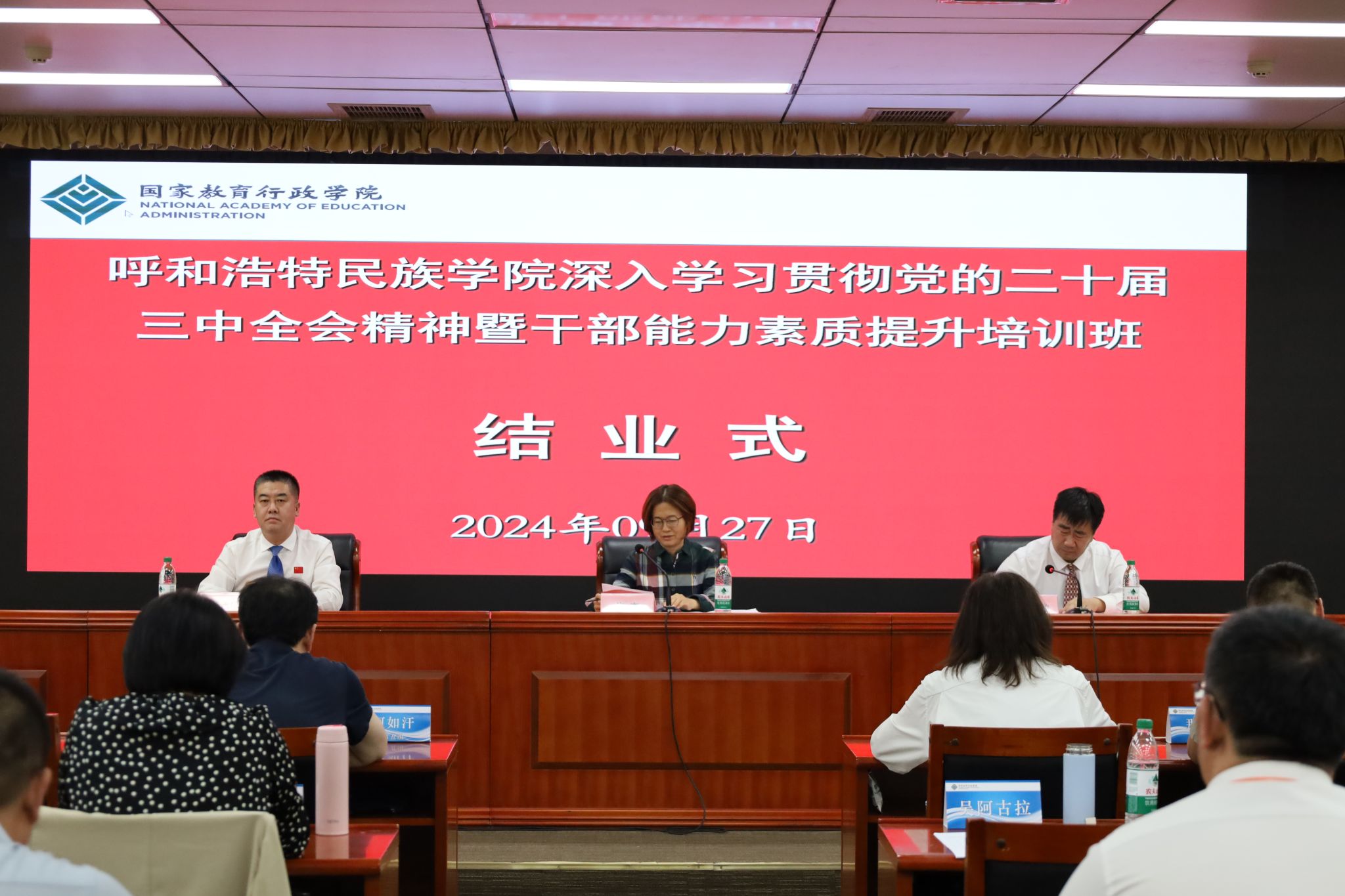 9月27日,培訓班順利結業。學員代表高娃作交流發言,分享了培訓的收獲和體會。許杰對教學工作作總結時指出,本期培訓報告層次有權威性、內容體系有系統性、培訓方式體現多樣性,同時充分發揮了學員參與性、能動性,每場報告由學員代表主持,展現了呼和浩特民族學院處級干部扎實的專業素質和強烈的事業心。學校黨委委員、組織部部長吳阿古拉作總結講話。他對國家教育行政學院的精心組織與安排表示感謝。他表示,為期一周的培訓學習,全體學員嚴格按照培訓安排,以飽滿的熱情、積極的態度、嚴肅的紀律完成了本次培訓任務,達到了預期的學習效果。他希望各位學員在總結思考中消化學習內容、在對標找差中提升業務能力、在狠抓落實中展現責任擔當。