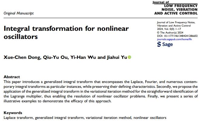 近日,我校數學與大數據學院數學與應用數學專業2021級本科生董學晨、歐秋宇和吳怡函撰寫的學術論文“Integral Transformation for Nonlinear Oscillators”在國際學術期刊《Journal of Low Frequency Noise, Vibration and Active Control》上在線發表,論文通訊作者為數學與大數據學院黃大年式教師團隊于佳暉博士。