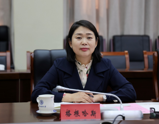 格根哈斯對貴州民族大學長期以來的關(guān)心支持表示衷心感謝,并說明了此次考察調(diào)研目的,介紹了我校基本情況及近年來在開展鑄牢中華民族共同體意識宣傳教育研究方面所積累的經(jīng)驗做法和在非遺研究方面所開展的工作概況。她希望兩校以此次交流為契機,推動雙方在民族高等教育經(jīng)驗方面的互學互鑒,深化民族高校間的聯(lián)系互動,在人才培養(yǎng)、科學研究、團隊建設(shè)、平臺建設(shè)等方面開展深入交流合作。
