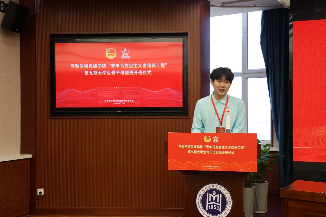 開班式上,劉九萬為本期培訓班授旗,并以《篤行致遠 不負韶華,奮力書寫為中國式現代化挺膺擔當的青春篇章》為題講授了專題思政課。他說,新時代呼民院青年要進一步深入學習貫徹黨的二十屆三中全會精神,從時代維度,充分認識當代青年成長發展所面臨的復雜環境與嚴峻形勢,堅定對馬克思主義的信仰、對中國特色社會主義的信念、對中華民族偉大復興的信心,努力成為鑄牢中華民族共同體意識的播種者和傳播者,為強國建設、民族復興偉業作出應有貢獻。