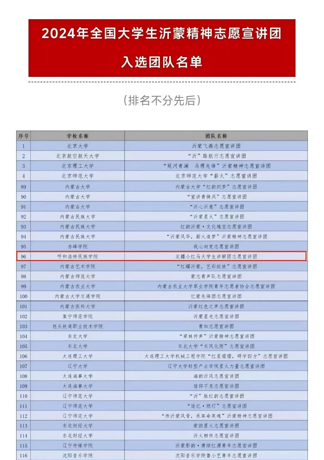 近日,由中共團中央青年志愿者行動指導中心、中共臨沂市委、共青團山東省委聯合開展的2024年全國大學生沂蒙精神志愿宣講團入選團隊名單公布,由我校文學院老師劉麗穎指導,陳宣錦、趙婉晴、海塔拉、包達日汗、杜金欣、張珈瑜、索日娜、鄭杉、王吉婷、崔佳琦10名學生組隊申報的“北疆小紅馬大學生講解團”志愿宣講團成功入選。