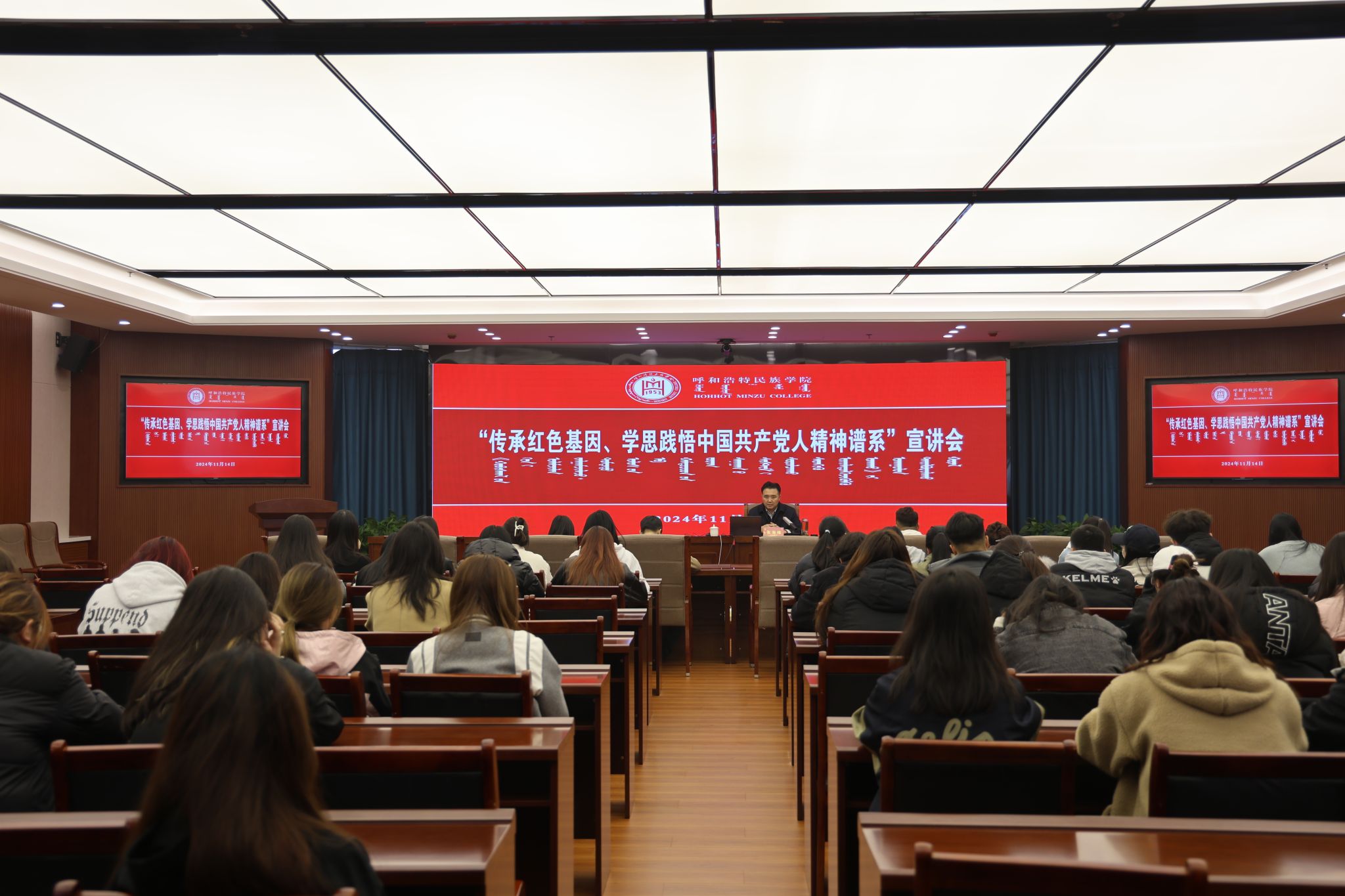 為深入學(xué)習(xí)貫徹習(xí)近平新時(shí)代中國(guó)特色社會(huì)主義思想,傳承和弘揚(yáng)中國(guó)共產(chǎn)黨人精神譜系,常態(tài)長(zhǎng)效開(kāi)展黨史學(xué)習(xí)教育,11月14日,學(xué)校舉辦“傳承紅色基因、學(xué)思踐悟中國(guó)共產(chǎn)黨人精神譜系”第二場(chǎng)專題宣講報(bào)告會(huì)。校黨委宣傳部部長(zhǎng)張海峰以《以偉大建黨精神涵養(yǎng)蒙古馬精神》為題作了專題宣講。