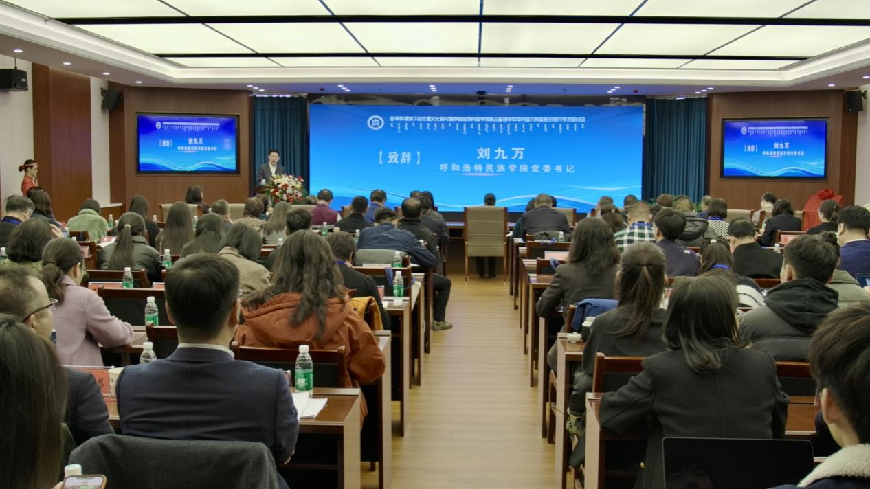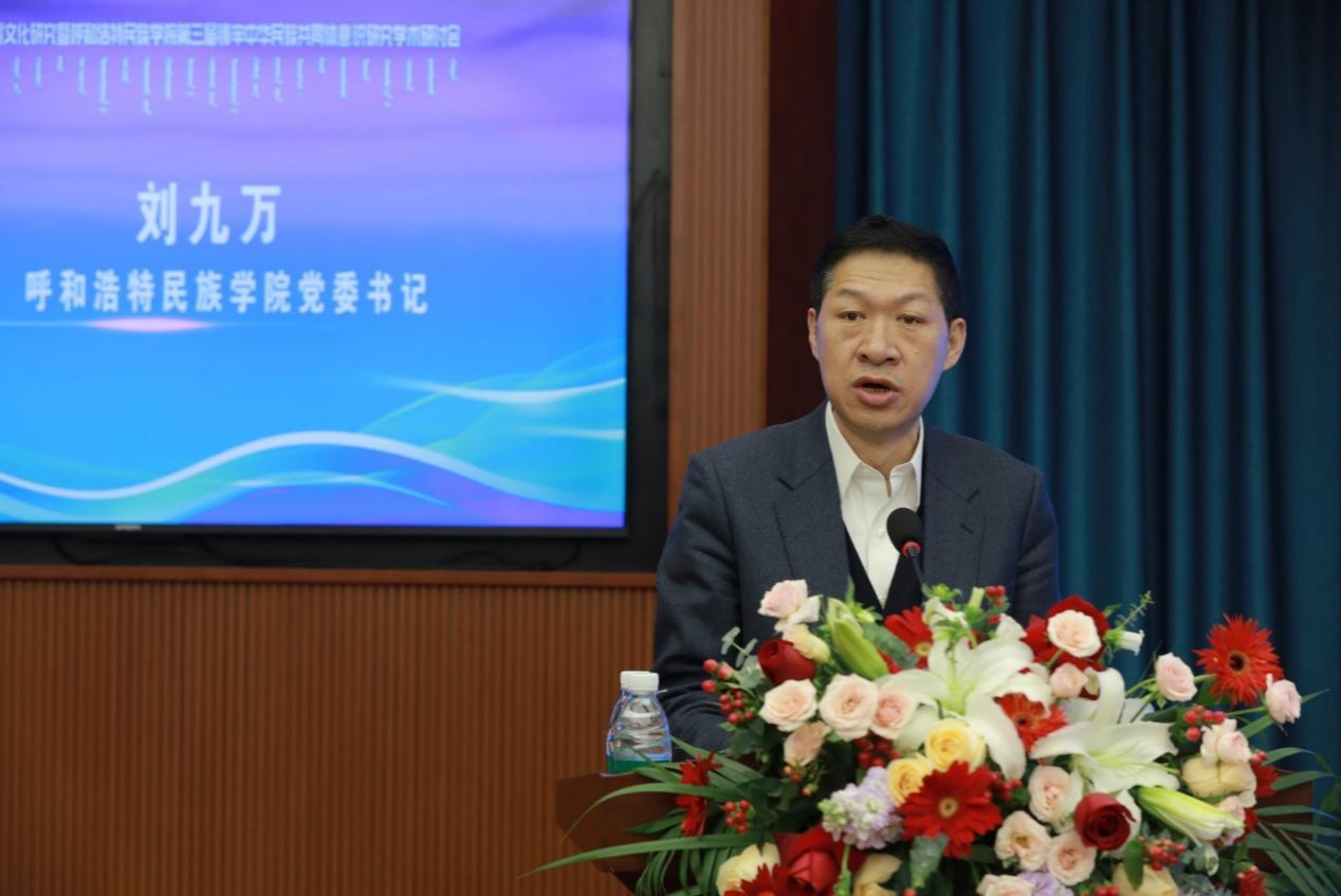 劉九萬對與會專家學者及嘉賓們的到來表示熱烈歡迎,并簡要介紹了學校歷史沿革、發展歷程及近年來在貫徹鑄牢中華民族共同體意識工作主線所取得的成績。他表示,學校舉辦“多學科視域下的北疆文化研究暨呼和浩特民族學院第三屆鑄牢中華民族共同體意識研究學術研討會”,既是服務國家重大戰略和自治區兩件大事的具體舉措,也是賡續學校民族團結進步教育底色的重要實踐。研討會將一如既往地堅持以習近平新時代中國特色社會主義思想為指導,將把學習貫徹黨的二十屆三中全會精神與習近平總書記關于加強和改進民族工作的重要思想結合起來,立足北疆文化鮮明特質,持續深化相關基礎理論和重大現實問題研究。他指出,學校黨委堅決貫徹落實“鑄牢”兩個主線要求,始終牢記習近平總書記殷殷囑托,將把鑄牢中華民族共同體意識作為學校人才培養的生命線,將其貫穿到立德樹人、辦學治校各方面,積極探索鑄牢中華民族共同體意識實踐路徑。他希望,與會專家學者將以此次學術研討會為交流平臺,深入開展鑄牢中華民族共同體意識理論研究和闡釋,為推進“北疆文化”建設增添助力,為打造“北疆文化”品牌提供深厚學術支撐,真正讓植根在北疆大地的優秀文化在新時代活起來、火起來。