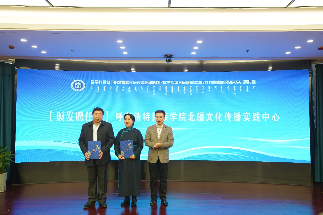 研討會開幕期間還舉行了呼和浩特民族學院北疆文化傳播實踐中心揭牌儀式暨頒發聘任書儀式。周曉梅、云冰為中心揭牌,額爾敦布和為吳海龍、包金花頒發中心聘書。