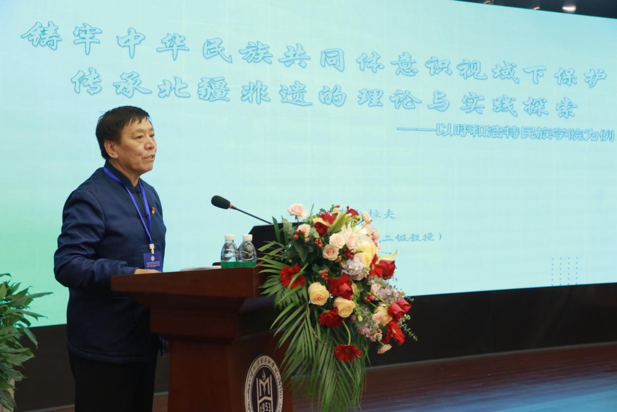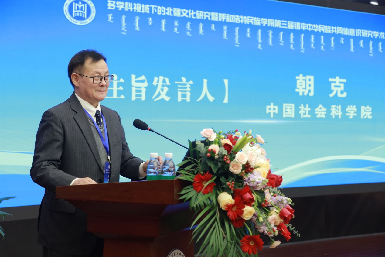 主旨發言環節,國家哲學社會科學領軍人才、中國社會科學院朝克教授以“鑄牢中華民族共同體意識視域下內蒙古三少民族旅游產業發展研究”為題,教育部長江學者、內蒙古大學烏云畢力格教授以“洲際使團與民族文化交往:十七世紀伏爾加河流域土爾扈特人使團與世界地理知識的傳播”為題,蘭州大學二級教授徐黎麗以“如何提升阿爾山-松貝爾口岸發展理念”為題,教育部新世紀優秀人才、中國人民大學特聘教授匡文波以“Al時代北疆文化品牌全媒體傳播體系建設研究”為題,呼和浩特民族學院二級教授包賽吉拉夫以“鑄牢中華民族共同體意識視域下保護傳承北疆非遺的理論與實踐探索---以呼和浩特民族學院為例”為題依次作了主旨發言。