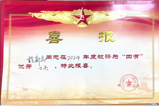 近日,學(xué)校武裝部收到中國(guó)人民解放軍65379部隊(duì)寄來(lái)的“四有”優(yōu)秀士兵喜報(bào)。我校商學(xué)院畢業(yè)生戴新念,因在部隊(duì)軍事訓(xùn)練和紀(jì)律作風(fēng)等方面表現(xiàn)突出,被部隊(duì)評(píng)為2024年度“四有”優(yōu)秀士兵榮譽(yù)。