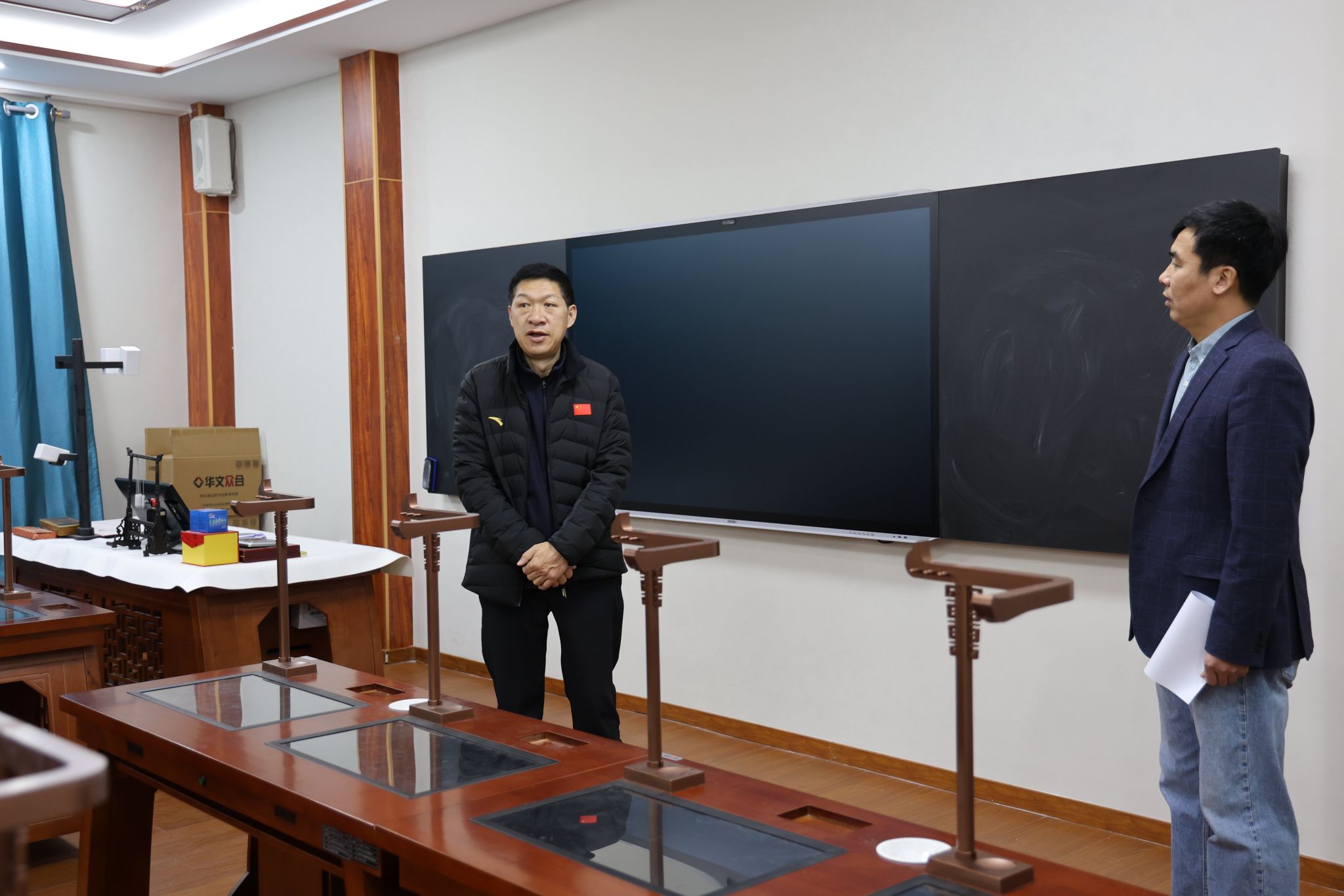 劉九萬一行先后走訪了智能書法教室、微課錄制室、微格教室、VR實訓室、教具室、創新創業孵化基地等實驗實訓場所。每到一處,劉九萬都認真聽取相關部門負責人的匯報,詳細了解實驗實訓設備的配置、使用效率、維護保養等情況,仔細詢問實驗實訓課程的開設、教學安排、師資配備以及學生實踐操作情況,查看實驗實訓室的環境布局、安全設施配備等細節。