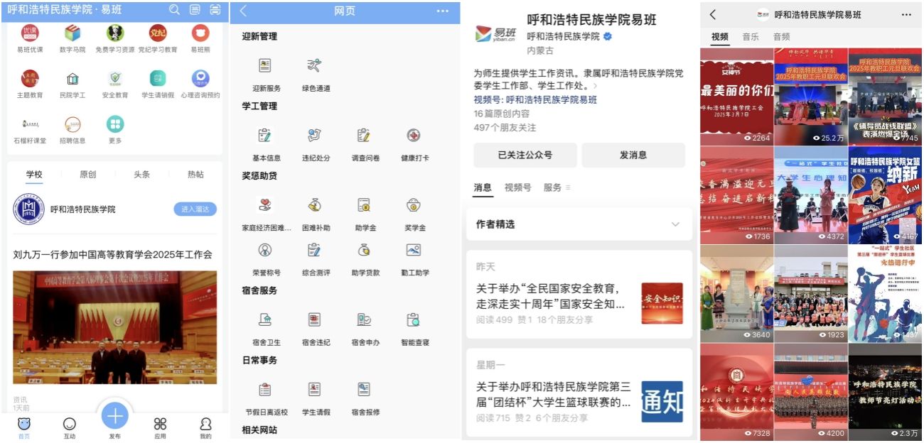 六年來,我校易班發展中心積極推進落實《教育部等八部門關于加快構建高校思想政治工作體系的意見》,堅持以學生為中心,強化數字賦能,充分發揮易班平臺的思想政治教育功能。在易班app內開發使用了“民院學工”系統(共21項應用功能:學生基本信息、迎新服務、綜合測評、家庭經濟情況認定、獎學金、助學金、困難補助、綠色通道、助學貸款、勤工助學、榮譽稱號、問卷調查、健康打卡、違紀處分、宿舍申辦、宿舍衛生、宿舍報修、智能查寢、宿舍違紀、學生請銷假、節假日離返校)和《“互聯網+”大學安全教育》系統(內設7大板塊34個單元700+門微課)。充分對接學校與大學生學習生活密切相關的校園服務工作,使易班成為“一站式”師生服務平臺;另外,依托易班平臺以每月一主題的形式開展校園文化活動。引導學生自覺遵守校規校紀,塑造積極人格,養成良好習慣。同時建立“呼和浩特民族學院易班”官方微信公眾號、視頻號,發布宣傳推文共505篇,平均閱讀量7000余次。發布剪輯短視頻67個,總共預覽量69.1萬余次。