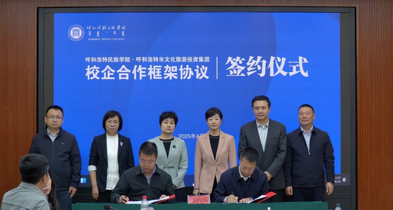 4月19日,學(xué)校在綜合樓11會議室與呼和浩特市文化旅游投資集團舉行校企合作框架協(xié)議簽約儀式。簽約前,校黨委書記劉九萬與呼和浩特市文化旅游投資集團黨委書記、董事長高麗芳一行共同參觀了學(xué)校鑄牢中華民族共同體意識教育館、校史館、非遺展廳。