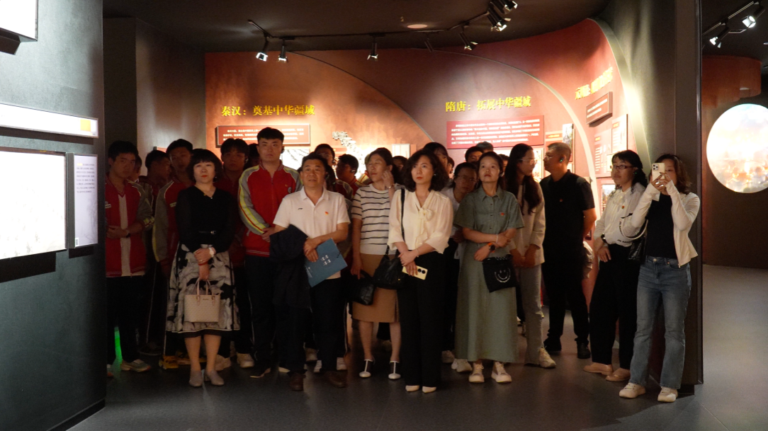 座談會后,呼和浩特市智能技術應用學校師生在鑄牢中華民族共同體意識教育館進行“行走的思政課”實踐教學。兩校思政課教師依托教育館豐富的展陳資源,現(xiàn)場切磋交流思政課教學方法。全體師生跟隨講解員走過“我們從哪里來”、“我們是誰”、“我們要到哪里去”等三部分主題展廳,通過圖文展板,數(shù)字演示和現(xiàn)場互動體驗,有形有感有效鑄牢中華民族共同體意識。