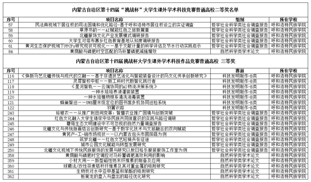 我校經過初賽、復賽,推送97個作品參加自治區決賽,其中《民法典視域下居住權的司法困境和優化路徑—基于呼和浩特市居住權設立的實證調查》等6個項目榮獲二等獎;《煥新馬藝北疆傳統與現代的交融——基于非遺技藝活化與智能裝備設計的馬文化傳承創新研究》等20個項目榮獲三等獎。