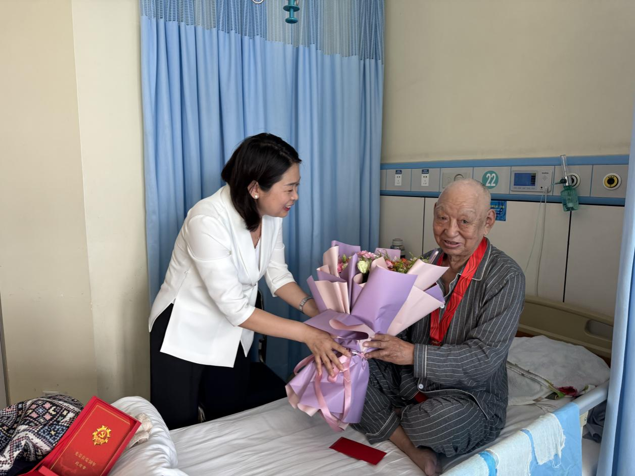 格根哈斯帶隊到內蒙古自治區中醫醫院,為住院的老黨員巴拉吉頒發“光榮在黨50年”紀念章,敬獻鮮花,送上慰問金。格根哈斯詳細詢問了老同志的身體和生活情況,衷心感謝老同志為學校發展做出的重要貢獻,并叮囑保重身體,安享晚年。
