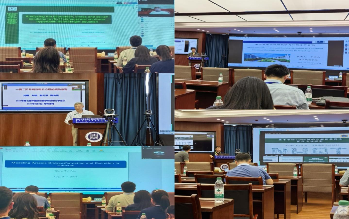 邀請報告環節,曲靖師范大學助理教授Muhammad Nadeem、河南城建學院李亞杰副教授、曲靖師范學院劉俊教授、廣州大學博士后 Q.T.Ain、國防科技大學曹小群教授分別以“Analyzing the bifurcation, chaos and soliton solutions to (3+1)-dimensional nonlinear hyperbolic Schr?dinger equation”“Stochastic bifurcation and bistable behaviors in a modified fractional Rayleigh system driven by recycling noise ”“Oscillation criteria of a class of second order nonlinear differential equations”“Modeling Arsenic Biotransformation and Excretion in Humans”“基于非Shannon 熵的非高斯非線性同化方法研究”為題作報告。