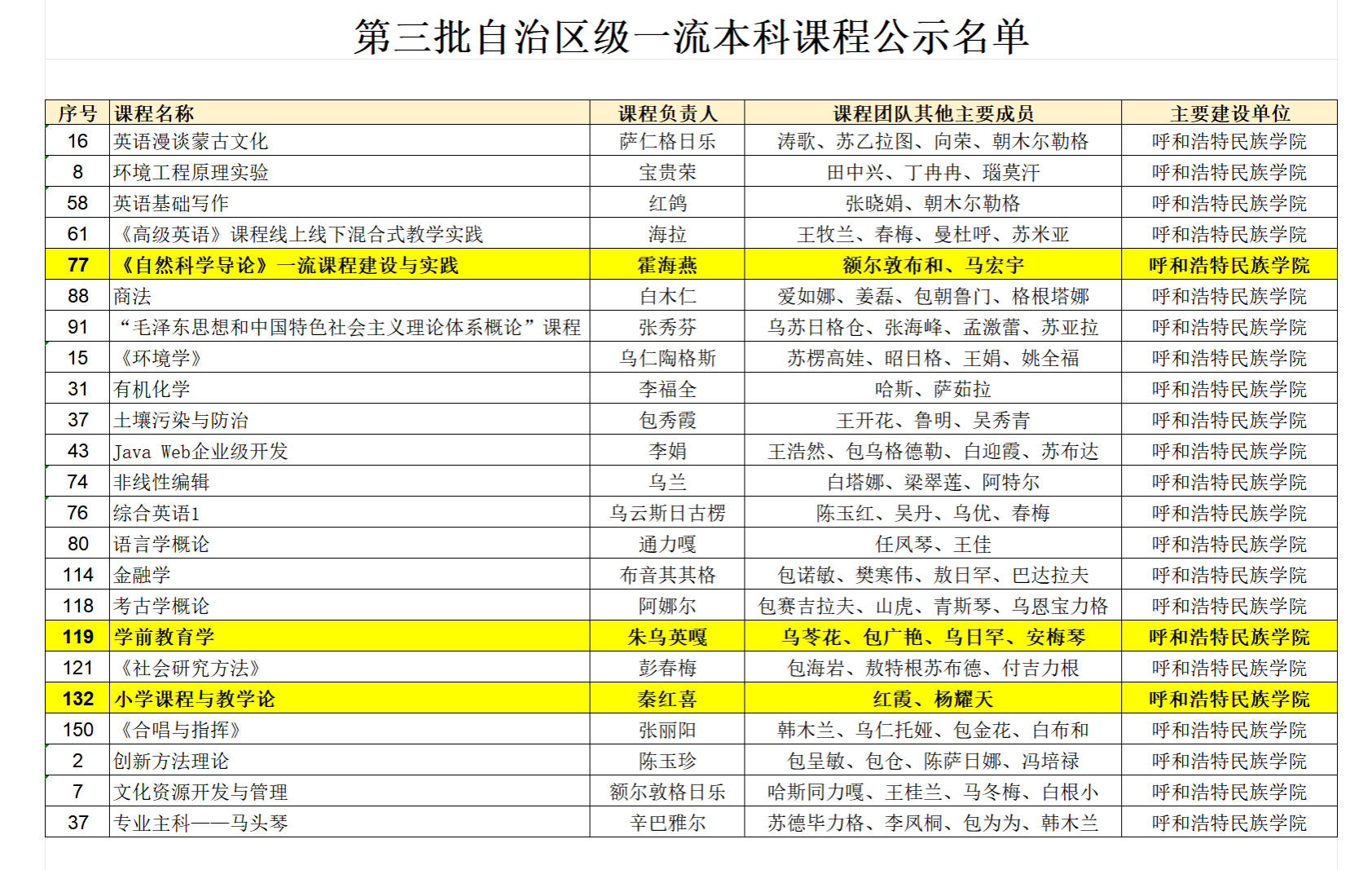 建設國家級一流課程《小學教育學》及自治區級一流課程《小學課程與教學論》《教育學原理》《自然科學導論》《學前教育學》等5門精品課程。形成基礎理論+實踐能力+創新素養的課程群體系,為邊疆地區基礎教育人才培養提供核心支撐。