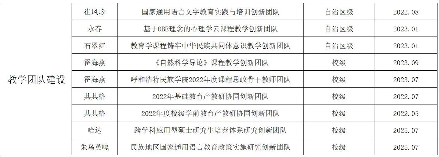 2019年教育學一級學科獲批國家民委重點建設學科;2020年小學教育專業獲批自治區級一流本科專業;2022年學前教育專業獲批國家級一流本科專業建設點;2024年獲批教育碩士點建設單位;2025年獲批1門國家級一流課程和2門自治區一流課程;