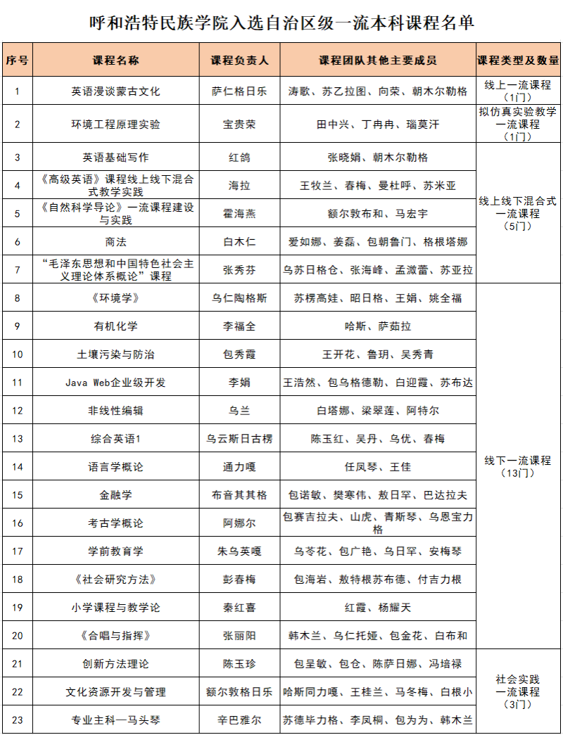 此次入選的23門課程中,包含線上一流課程1門、虛擬仿真實驗教學一流課程1門、線上線下混合式一流課程5門、線下一流課程13門、社會實踐一流課程3門。截至目前,學校共有37門課程入選自治區一流本科課程。