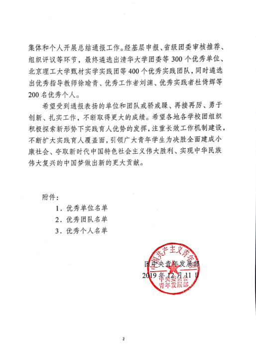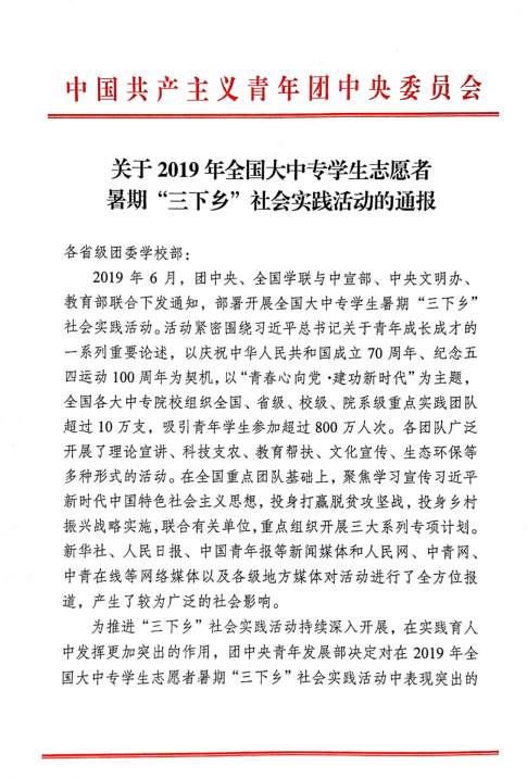 近日,團(tuán)中央學(xué)校部、全國學(xué)聯(lián)秘書處對在2019年全國大中專學(xué)生志愿者暑期“三下鄉(xiāng)”社會實(shí)踐活動中表現(xiàn)突出的集體和個人予以了總結(jié)通報(bào)。我校團(tuán)委榮獲本年度全國大中專學(xué)生志愿者暑期“三下鄉(xiāng)”社會實(shí)踐活動優(yōu)秀單位。