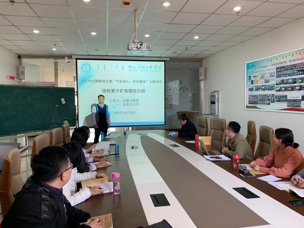 10月24日,數(shù)學(xué)與大數(shù)據(jù)學(xué)院黃大年式教師團(tuán)隊(duì)黨支部邀請(qǐng)內(nèi)蒙古大學(xué)數(shù)學(xué)科學(xué)學(xué)院吳德玉教授,在綜合樓807(黃大年式教師團(tuán)隊(duì)討論室)做了題目為《線性算子的擴(kuò)張理論介紹》專(zhuān)題講座,出席本次報(bào)告的有全國(guó)高校黃大年式教師團(tuán)隊(duì)帶頭人、我校副校長(zhǎng)阿拉坦倉(cāng)教授以及黃大年式教師團(tuán)隊(duì)成員。