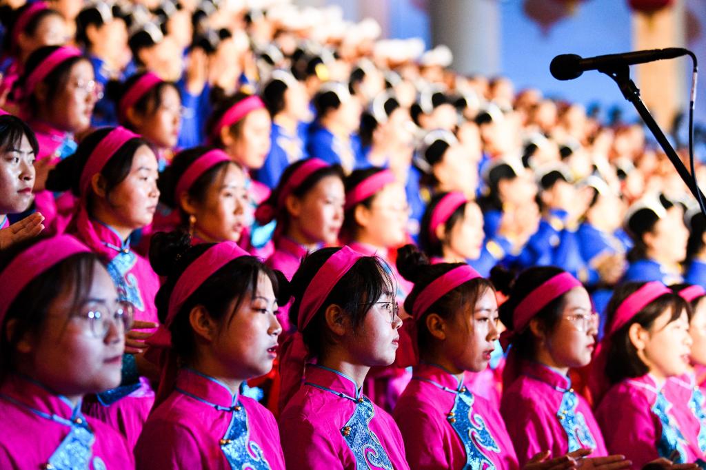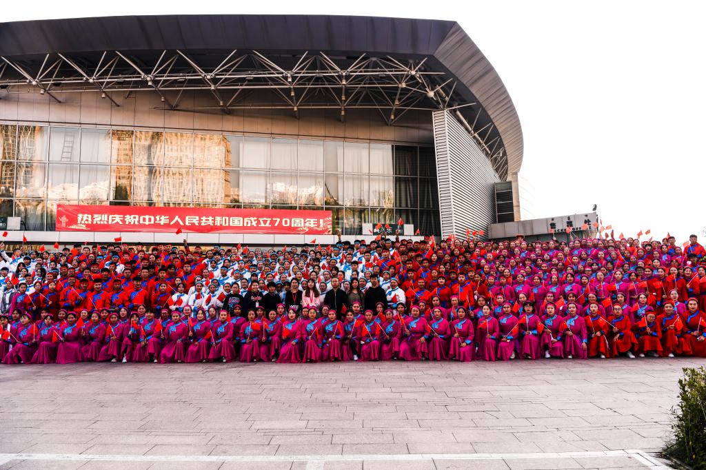 我校合唱團在著名歌唱家德德瑪老師的領唱下,共同唱響《美麗的草原我的家》,整齊劃一的動作,悠揚婉轉的歌聲,充分展現了民院學子的愛國熱情和精神風貌。并與現場所有合唱團共同演唱《各族人民心連心》、《守望相助》、《不忘初心》 、《我和我的祖國》、《歌唱祖國》等經典紅色曲目。我校合唱團用歌聲抒發喜迎中華人民共和國成立70周年的自豪與歡樂,唱出對偉大祖國母親的崇高祝福,共同唱響共產黨好、社會主義好、改革開放好、偉大祖國好、民族團結好的時代強音。