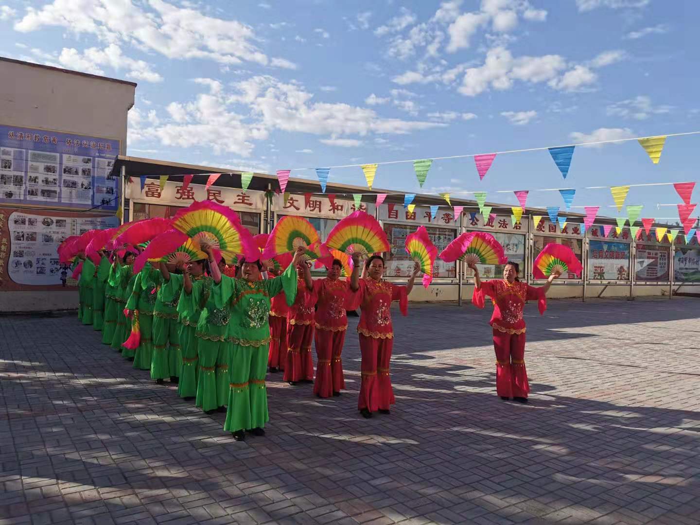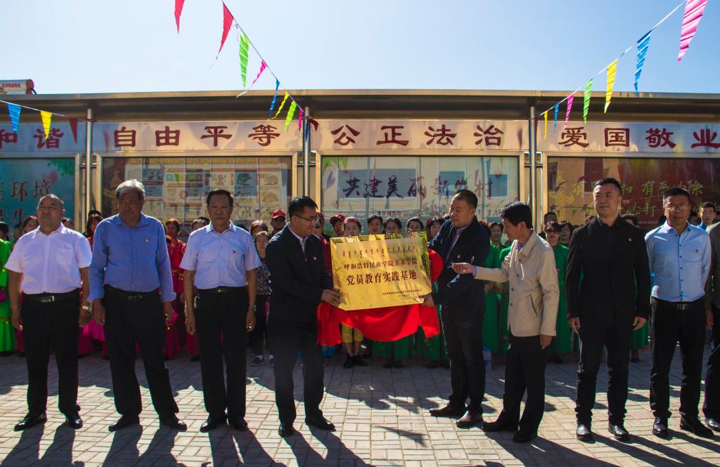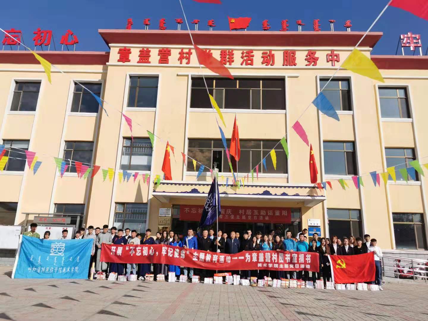 美術學院師生黨員以及章蓋營村黨員干部、村民代表100余人共升國旗,同唱國歌。升旗儀式結束后,呼和浩特市玉泉區區委常委、組織部部長張普,玉泉區人大副主任小黑河鎮黨委書記劉宇宏,美術學院黨總支書記包旭東共同為呼和浩特民族學院美術學院黨員教育實踐基地揭牌。隨后,學生黨支部書記魏偉向章蓋營村駐村第一書記鄭曉東捐贈黨建書籍和優秀民族文化書籍。玉泉區領導和美術學院師生黨員共同觀看了村藝術團和五塔社區聯合舉辦的“不忘初心慶國慶、村居互助話重陽”文藝演出。演出結束后,學生黨員開展了敬老、愛老的活動,與章蓋營村孤寡老人、村民代表共同包餃子、吃餃子。