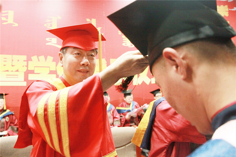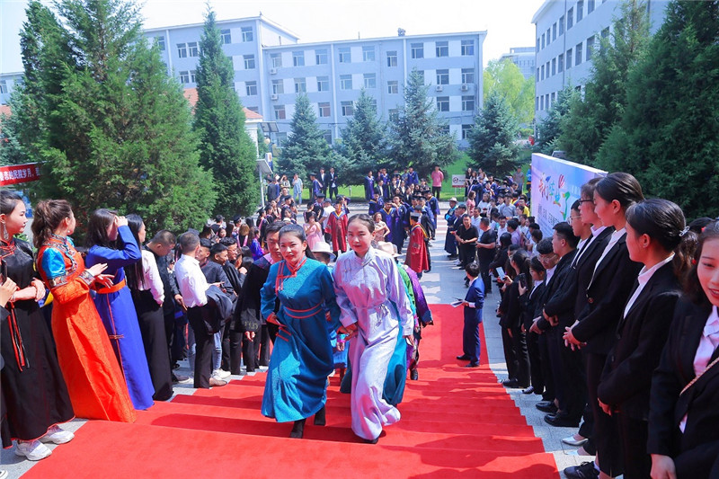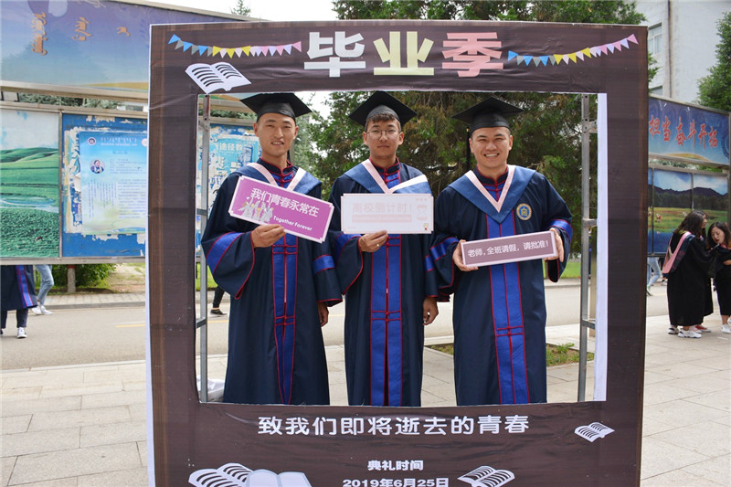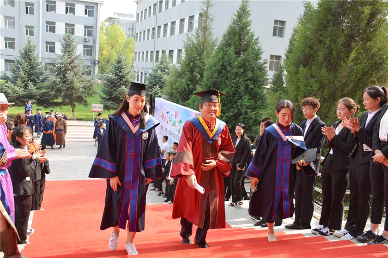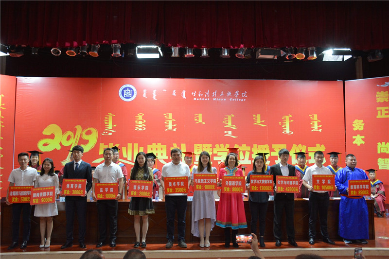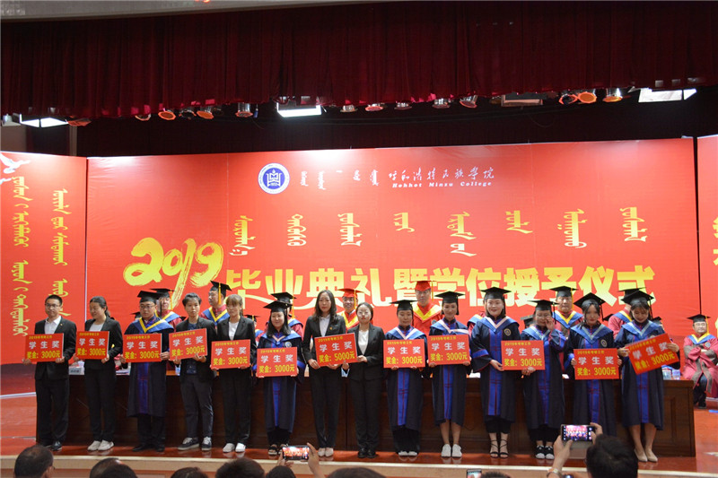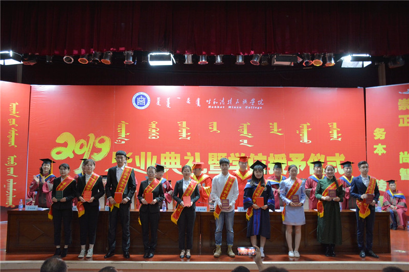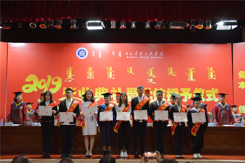 畢業典禮上教務處處長額爾敦布和宣讀了學校《呼和浩特民族學院2019屆第一批授予學位情況》;15個二級學院院長分別為畢業生寄語祝福,校領導為2019屆畢業生代表頒發了畢業證書并撥穗正官。