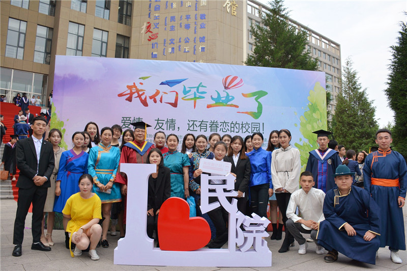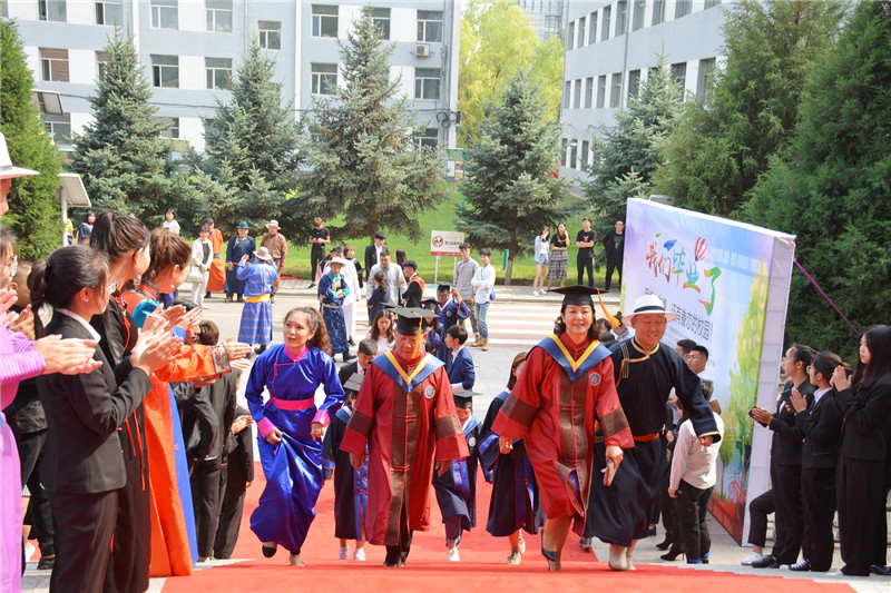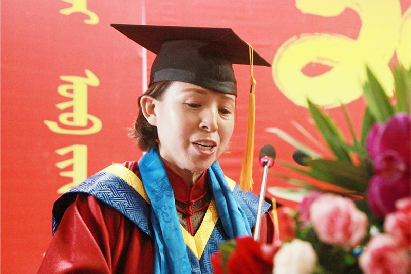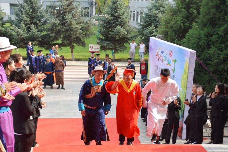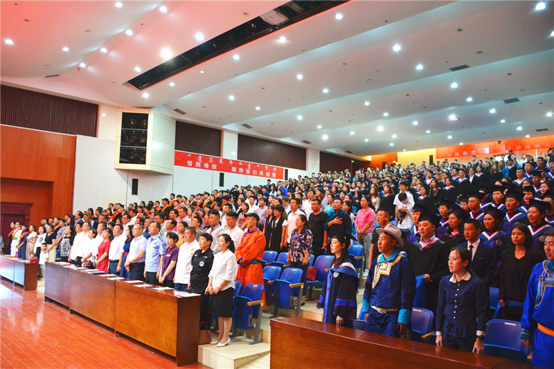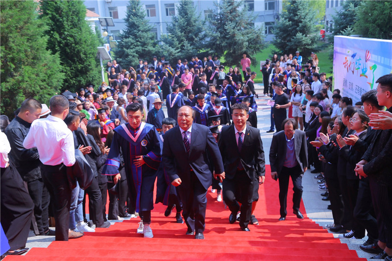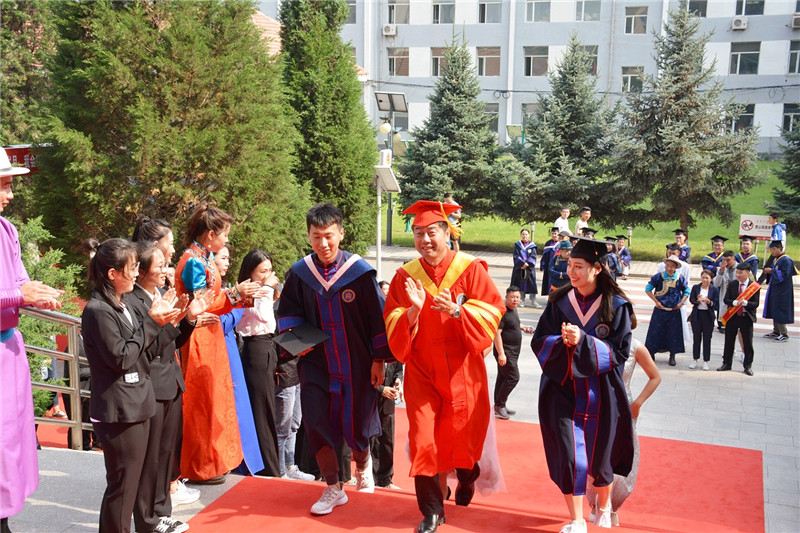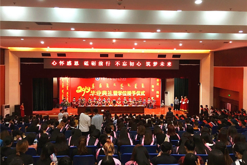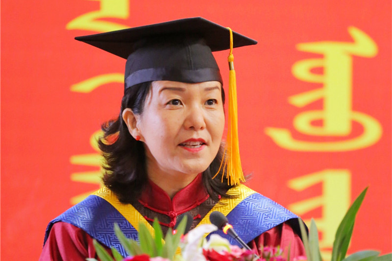 6月25日下午4時,我校2019屆學生畢業典禮暨學士學位授予儀式在圖書館二樓報告廳隆重舉行。學校黨委書記孫國權,黨委副書記、校長格日樂圖,黨委副書記胡春梅,副校長阿拉坦倉,副校長納麗娜等學校學位委員會成員、各二級學院院長與黨總支書記、各職能部門負責人,以及畢業班班主任、輔導員、教師代表、家長代表、畢業生代表近700人參加了畢業典禮。畢業典禮由納麗娜副校長主持。
