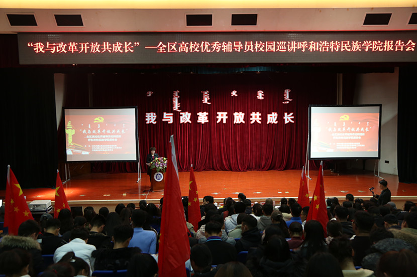報(bào)告會(huì)上,內(nèi)蒙古財(cái)經(jīng)大學(xué)輔導(dǎo)員范新宇、我校輔導(dǎo)員張海峰、內(nèi)蒙古工業(yè)大學(xué)輔導(dǎo)員尚進(jìn)、內(nèi)蒙古大學(xué)交通學(xué)院輔導(dǎo)員莫伶、內(nèi)蒙古農(nóng)業(yè)大學(xué)職業(yè)技術(shù)學(xué)院輔導(dǎo)員賀斐分別以《改革開放 彰顯中國(guó)智慧》、《改革開放精神引領(lǐng)》、《春風(fēng)化雨——改革開放40年中的文化繁榮》、《恰年少 風(fēng)鵬正舉》、《美麗鄉(xiāng)村“變形記”——從小崗村看改革開放40年》為題目作了宣講。五位輔導(dǎo)員從改革開放40年綜合變化、精神引領(lǐng)、文化繁榮、教育變革、鄉(xiāng)村變化等五個(gè)不同的角度,結(jié)合自身經(jīng)歷,以鮮活的事例與觀眾們分享了他們與改革開放共成長(zhǎng)的故事,內(nèi)容既有小視角,又有大格局,贏得了現(xiàn)場(chǎng)陣陣掌聲。
