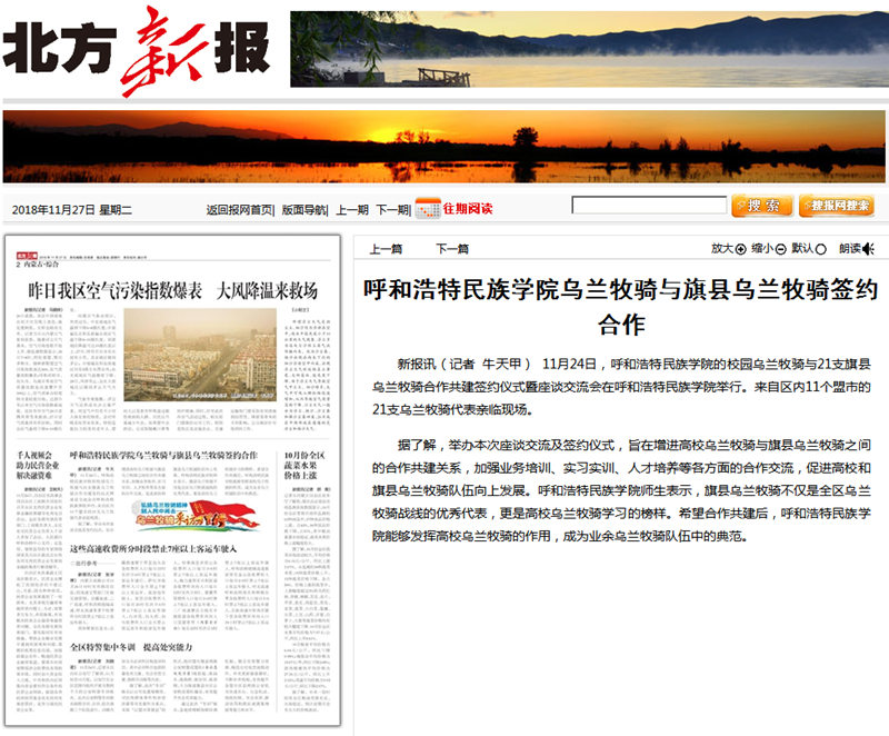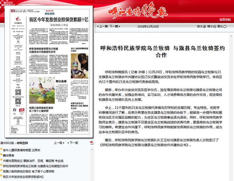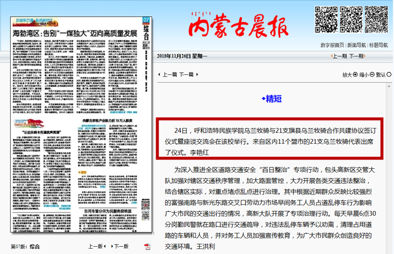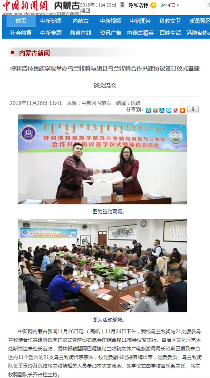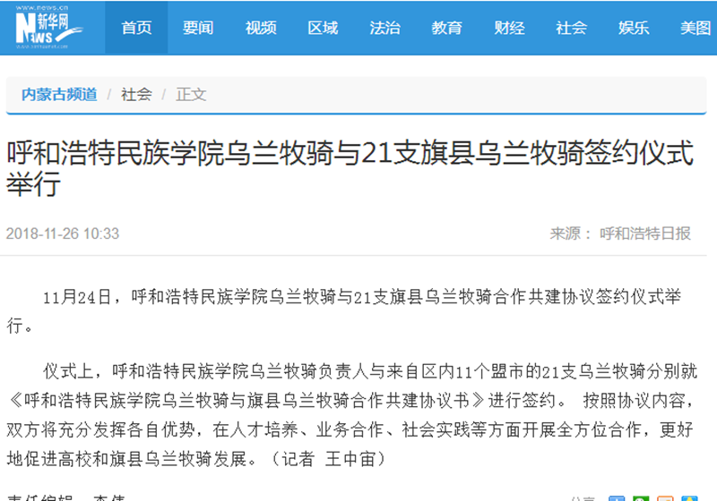 11月24日,我校烏蘭牧騎與21家旗縣烏蘭牧騎舉行舉行簽字儀式,并就下一步合作共建進行交流座談。連日來,內蒙古廣播電視臺、呼和浩特廣播電視臺、《內蒙古日報》(蒙漢文版)、《北方新報》、《呼和浩特日報》、《呼和浩特晚報》、新華網、中國新聞網、呼和浩特新聞網、呼和浩特廣播電臺等12家自治區主流媒體對活動進行了報道,內蒙古新聞網、新浪網等8家媒體進行了轉載報道。通過媒體的廣泛關注,進一步展示我校烏蘭牧騎隊伍的風采,提高了我校烏蘭牧騎的影響力。