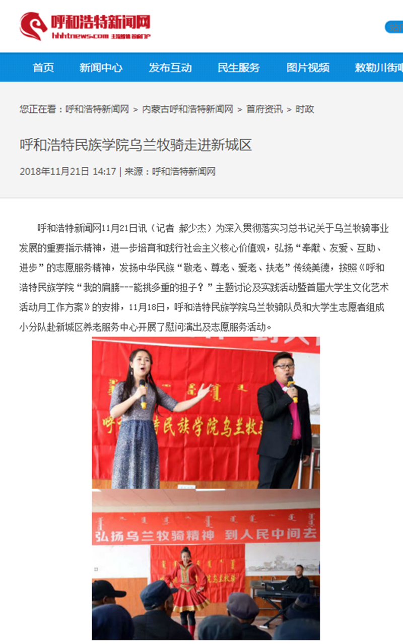 近日,中國新聞網、呼和浩特新聞網、大學生手機報先后報道我校烏蘭牧騎隊員和大學生志愿者組成小分隊赴新城區養老服務中心開展的慰問演出及志愿服務活動。我校烏蘭牧騎自成立以來,陸續開展了7場演出活動,得到了區內外媒體的廣泛關注,這不僅是我校烏蘭牧騎的光榮,也提高了學校的美譽度。