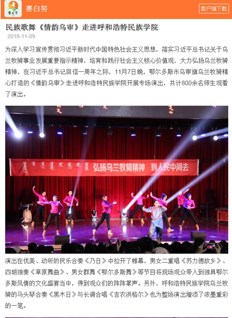 11月7日,鄂爾多斯市烏審旗烏蘭牧騎《情韻烏審》來我校開展專場演出。本場演出體現(xiàn)出濃郁的鄂爾多斯風情和鮮明的烏蘭牧騎特色,具有藝術(shù)性和觀賞性,受到現(xiàn)場師生的喜愛。 中國新聞網(wǎng)、呼和浩特新聞網(wǎng)、北疆大學生、內(nèi)蒙古旅游融媒體對活動進行了專題報道。