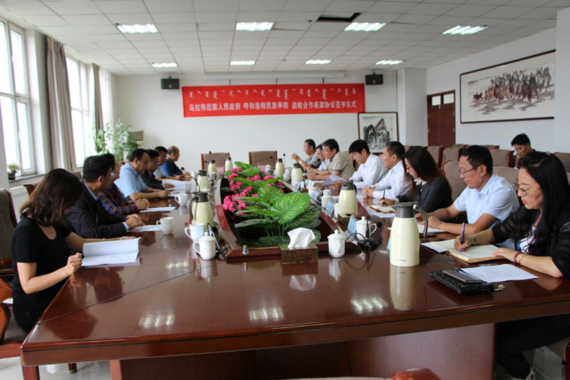 格日樂圖院長介紹了我校的基本情況、辦學歷史、辦學特色和學科專業特色,并指出,推動校地戰略合作,加強高校與地方的聯系與交流,促進產學研結合,提高人才培養質量,是我校應盡的職責。希望與烏拉特后旗在人才培養、教學科研及文體方面的應用及推廣、文化旅游和推介招商等方面,加強合作與交流,進一步提高我校的育人水平和服務社會水平,為傳承民族文化,服務民族地區經濟社會發展、推動民族團結進步做出貢獻。