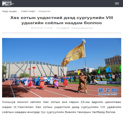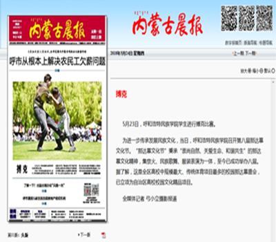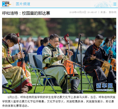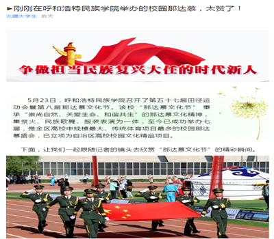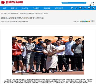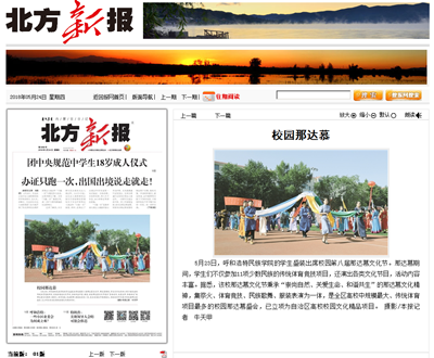 經學校黨委宣傳部的大力推廣和團委、網絡中心、保衛處、后勤管理處、體育系等部門的協助,本次那達慕文化節的媒體宣傳工作實現了歷史性突破。截止到5月28日,共有30家新聞媒體進行了專題報道,媒體覆蓋廣度和宣傳報道力度是建校以來之最。其中,《中國日報》(英文名稱《China Daily》,全球發行,期均90余萬份)在顯要位置以圖片新聞報道;《中國青年報》《內蒙古日報》(蒙古語、漢語版)《呼和浩特日報》《北方新報》《呼和浩特晚報》《內蒙古晨報》7家報紙媒體進行了頭版報道,《內蒙古日報》(蒙古語版)整版報道;內蒙古衛視2個電視頻道,新華社、人民網、光明網、新華網、中國新聞網等11家網站,中央人民廣播電臺、中國蒙古語廣播電臺、內蒙古廣播電臺蒙古語頻道、呼和浩特新聞廣播等3家電臺,影像內蒙古、北疆大學生、內蒙古客戶端、內蒙古日報等4家主流微信公眾號進了報道;新浪網、網易網、中國民族宗教網、《山西日報》等僅百余網站、媒體進行了轉載報道。