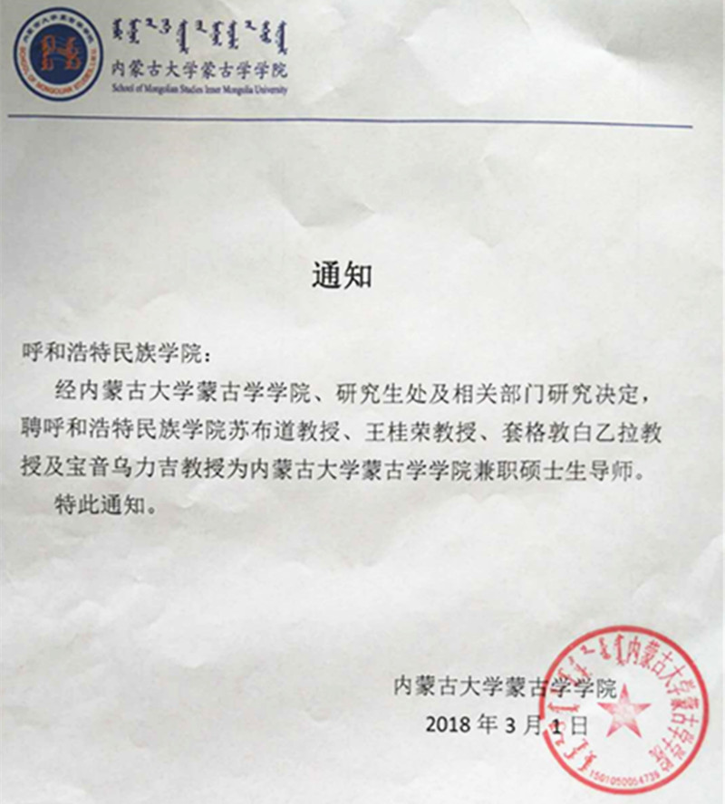 為了進(jìn)一步推進(jìn)民族高校學(xué)科建設(shè)發(fā)展,加強(qiáng)我校師資隊(duì)伍建設(shè),進(jìn)一步提升高校人才培養(yǎng)水平,推動(dòng)校校合作深入發(fā)展,2017年10月我校擬選中國(guó)少數(shù)民族語言文學(xué)專業(yè)蘇布道教授、套格敦白乙拉教授、王桂榮教授和寶音烏力吉教授為內(nèi)蒙古大學(xué)蒙古學(xué)學(xué)院兼職碩士生導(dǎo)師,此意向于2018年5月正式獲批。(蒙古語言文學(xué)系供稿)