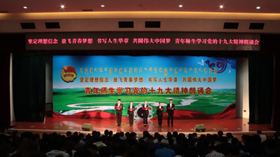 朗誦會(huì)由美術(shù)系團(tuán)總支選送的《不忘初心,方得始終》拉開(kāi)序幕,慷慨激昂的朗誦打動(dòng)著現(xiàn)場(chǎng)每一位觀眾;傳媒系團(tuán)總支選送的《和平發(fā)展的時(shí)代》展現(xiàn)了我國(guó)珍愛(ài)和平、構(gòu)建命運(yùn)共同體的發(fā)展理念;校廣播站朗誦的《新時(shí)代 新征程》詮釋赤子之心的愛(ài)國(guó)情懷。朗誦會(huì)還現(xiàn)場(chǎng)演繹了《步入新時(shí)代,開(kāi)啟新篇章》、《保護(hù)綠水青山,建設(shè)美麗中國(guó)》、《向著新時(shí)代邁進(jìn)》、《放飛青春夢(mèng)想,書(shū)寫(xiě)人生華章》等作品,時(shí)而慷慨激昂、時(shí)而溫婉細(xì)膩的演繹深深感染了在場(chǎng)觀眾。最后,教師代表旭日、圖木舍等人共同朗誦的《擔(dān)當(dāng)新時(shí)代的青春使命,實(shí)現(xiàn)新時(shí)代的中國(guó)夢(mèng)》把活動(dòng)氣氛推向高潮,也為活動(dòng)畫(huà)下了完滿的句號(hào)。