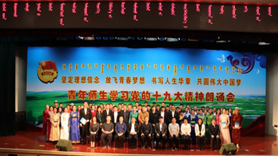 五月的春風(fēng)情深意暖,五月的花海流溢飄香。為紀(jì)念五四運(yùn)動(dòng)99周年和建團(tuán)96周年,弘揚(yáng)五四精神,激勵(lì)全校青年奮發(fā)進(jìn)取,5月4日下午,我校團(tuán)委在圖書(shū)館二樓報(bào)告廳舉辦了“堅(jiān)定理想信念 放飛青春夢(mèng)想 書(shū)寫(xiě)人生華章 共圓偉大中國(guó)夢(mèng)”青年師生學(xué)習(xí)黨的十九大精神朗誦會(huì)。內(nèi)蒙古自治區(qū)黨委第四巡視組領(lǐng)導(dǎo),學(xué)校黨委書(shū)記孫國(guó)權(quán),黨委副書(shū)記、院長(zhǎng)格日樂(lè)圖,黨委副書(shū)記胡春梅,副院長(zhǎng)阿拉坦倉(cāng),副院長(zhǎng)納麗娜出席朗誦會(huì),各職能部門(mén)負(fù)責(zé)人,各系部黨、團(tuán)總支書(shū)記和學(xué)生代表共計(jì)750余人觀看了朗誦會(huì)。