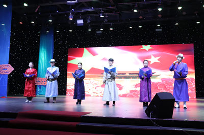 演出在馬頭琴齊奏《鄂爾多斯高原》中拉開(kāi)帷幕。蒙語(yǔ)詩(shī)朗誦《偉大的黨》抒發(fā)了莘莘學(xué)子對(duì)黨的無(wú)限愛(ài)戴;藏族學(xué)生舞蹈《扎西德勒》、蒙漢詩(shī)朗誦《啟程》激情澎湃,寓意深遠(yuǎn);詩(shī)朗誦《廉潔頌》慷慨激昂,充滿正能量;蒙語(yǔ)歌曲《我們?cè)谝黄稹飞鷦?dòng)活潑,純樸甜美;漢語(yǔ)歌曲《映山紅》、《中國(guó),中國(guó),鮮紅的太陽(yáng)永不落》渾厚雄壯,表達(dá)了青年學(xué)子不忘初心,繼續(xù)奮斗的堅(jiān)定信念;最后,在嘹亮高昂的教師代表男女對(duì)唱《守望相助》中文藝匯演圓滿落下帷幕。