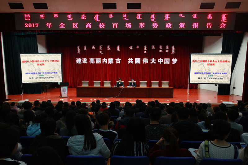 為深入貫徹全國全區(qū)高校思想政治工作會議精神,落實自治區(qū)黨委《關(guān)于推動高校形勢政策報告會制度化常態(tài)化的意見》,12月7日下午,學(xué)校邀請中央民族大學(xué)榮譽資深教授、國家民委咨詢專家、博士生導(dǎo)師金炳鎬教授作了題為《新時代中國特色社會主義民族理論新發(fā)展》的形勢政策報告。學(xué)校黨委中心組成員、副處級以上干部、思政工作人員、離退休人員代表、教師代表和學(xué)生骨干共700多人參加。報告會由學(xué)校黨委副書記、院長格日樂圖主持。