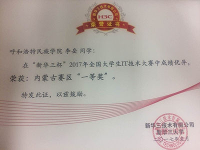 大賽分初賽、復賽和決賽三個階段。全國共有31個省份550多所院校的5300多名本專科生報名,經過5月份的初賽,1250余人進入復賽;6月初進行的復賽中,我校李岳同學在內蒙古賽區選手中脫穎而出,獲得了“新華三杯”2017全國大學生IT技術大賽內蒙古賽區“一等獎”,并代表自治區參加了最終決賽。在7月初的決賽中,經過筆試、上機考試、搶答等環節,最終李岳同學獲得了“新華三杯”2017全國大學生IT技術大賽內蒙古賽區“特等獎”,李海軍老師榮獲“優秀指導教師”稱號。閉幕式后,新華三集團舉辦了專場招聘會,為所有參賽選手提供了就業崗位。