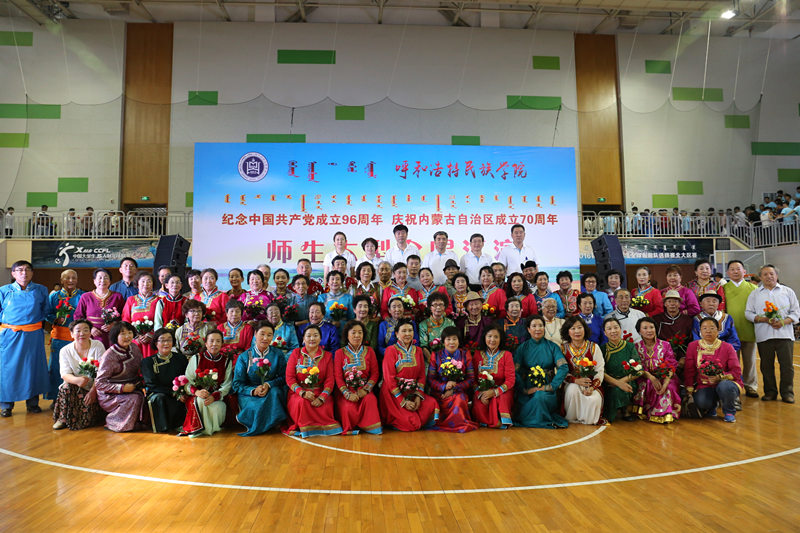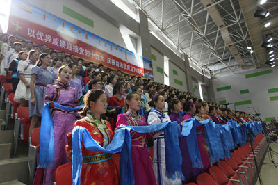 為紀(jì)念中國共產(chǎn)黨成立96周年和內(nèi)蒙古自治區(qū)成立70周年,以優(yōu)異成績迎接黨的十九大勝利召開,根據(jù)學(xué)校《紀(jì)念自治區(qū)成立70周年活動方案》和《“兩學(xué)一做”學(xué)習(xí)教育常態(tài)化制度化實施方案》,2017年6月30日下午,我校在體育館三樓室內(nèi)籃球館舉辦了以“紀(jì)念中國共產(chǎn)黨成立96周年慶祝內(nèi)蒙古自治區(qū)成立70周年”為主題的師生大型合唱匯演。全校職能部門、各系部師生代表共2000多人參加演出。