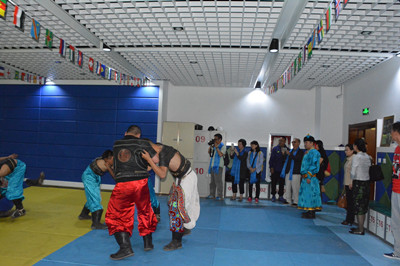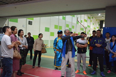 盧沃棠先生一行首先參觀了我校體育館,現場體驗及詳細了解了蒙古族“搏克”、“民族健身操”、“沙嘎游藝”、“沙嘎哈日靶”、“蒙古象棋”、“包根吉日格”、“傳統射箭”、“傳統布魯”等傳統教學項目。隨后,考察了校園及周邊環境,現場聽取了學校工作情況匯報,并就有關問題與校領導進行了交流。