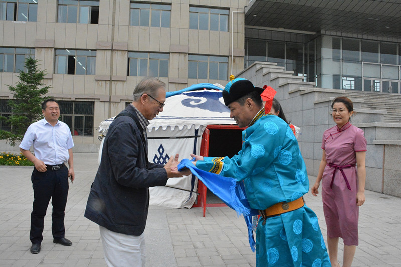 格日樂圖院長在天驕廣場前以蒙古族禮儀迎接了盧沃棠先生一行。