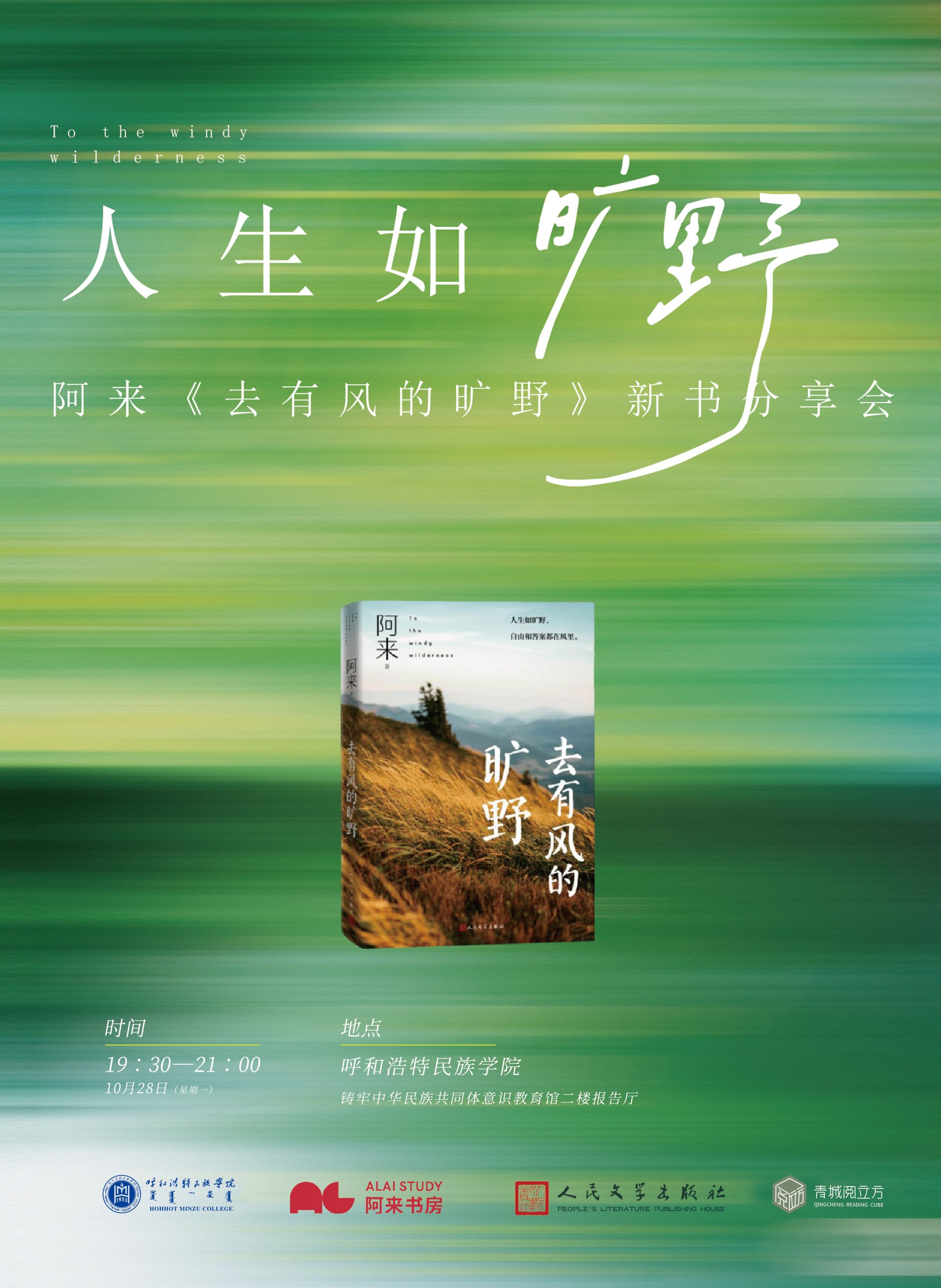 阿來:《去有風的曠野》新書分享會,10月28日(星期一)19:30—21:00。地點:鑄牢中華民族共同體意識教育館二樓報告廳。